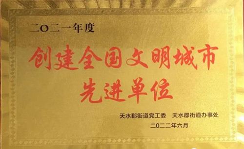 我公司獲得天水郡街道黨工委、天水郡街道辦事處頒發(fā)的2021年度“創(chuàng )建全國文明城市先進(jìn)單位”稱(chēng)號。