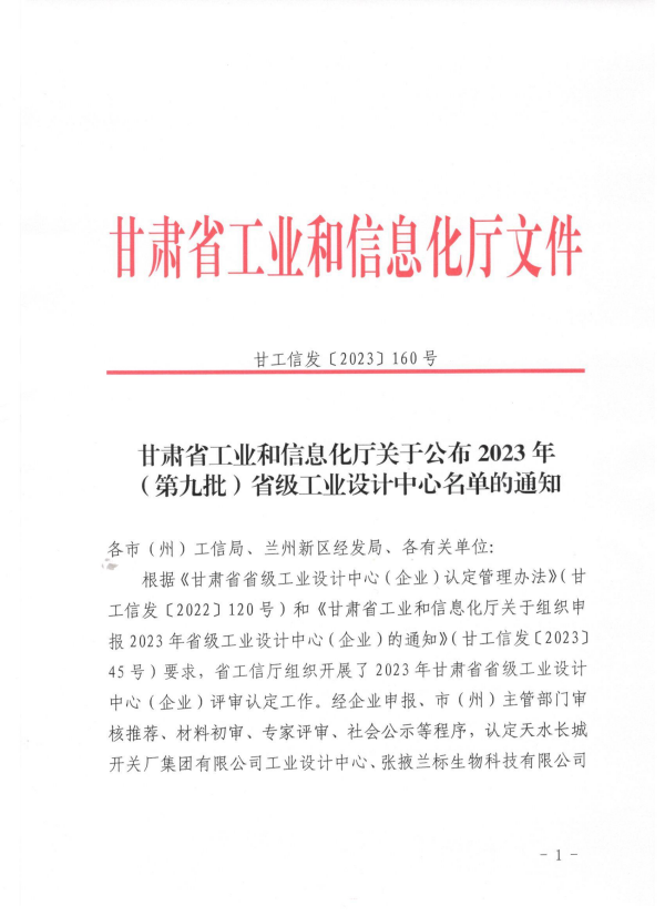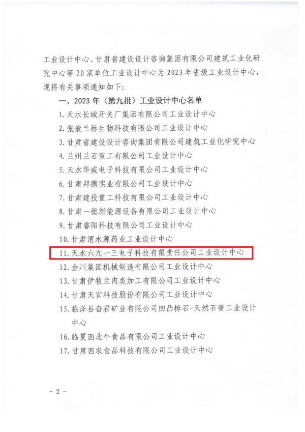 7410026月27日,甘肅省工業(yè)和信息化廳公布2023年(第九批)省級工業(yè)設計中心名單,經(jīng)省工信廳組織評審、公示,天水六九一三電子科技有限責任公司工業(yè)設計中心被認定為2023年省級工業(yè)設計中心。